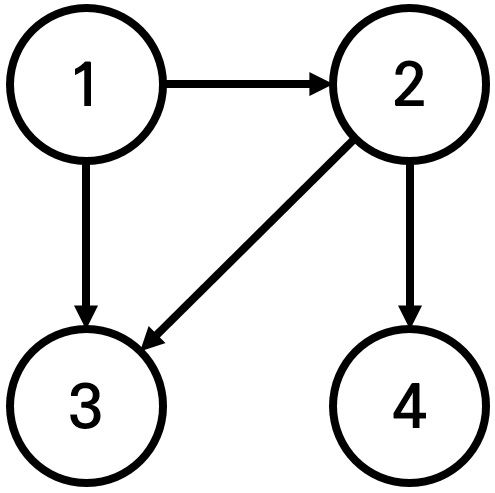 어떤 나라에는 1번부터 N번까지의 도시와 M개의 단방향 도로가 존재한다. 모든 도로의 거리는 1이다. 이 때 특정한 도시 X로부터 출발하여 도달할 수 있는 모든 도시 중에서, 최단 거리가 정확히 K인 모든 도시들의 번호를 출력하는 프로그램을 작성하시오. 또한 출발 도시 X에서 출발 도시 X로 가는 최단 거리는 항상 0이라고 가정한다. 예를 들어 N=4, K=2, X=1 일 때 다음과 같이 그래프가 구성되어 있다고 가정하자.