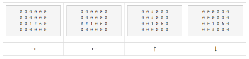 지도에서 0은 빈 칸, 6은 벽, 1~5는 CCTV의 번호이다. 위의 예시에서 1번의 방향에 따라 감시할 수 있는 영역을 '#'로 나타내면 아래와 같다.