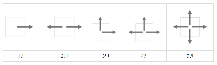1번 CCTV는 한 쪽 방향만 감시할 수 있다. 2번과 3번은 두 방향을 감시할 수 있는데, 2번은 감시하는 방향이 서로 반대방향이어야 하고, 3번은 직각 방향이어야 한다. 4번은 세 방향, 5번은 네 방향을 감시할 수 있다.