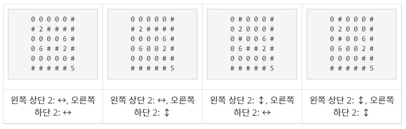 - 둘째 줄부터 N개의 줄에는 사무실 각 칸의 정보가 주어진다. 0은 빈 칸, 6은 벽, 1~5는 CCTV를 나타내고, 문제에서 설명한 CCTV의 종류이다.