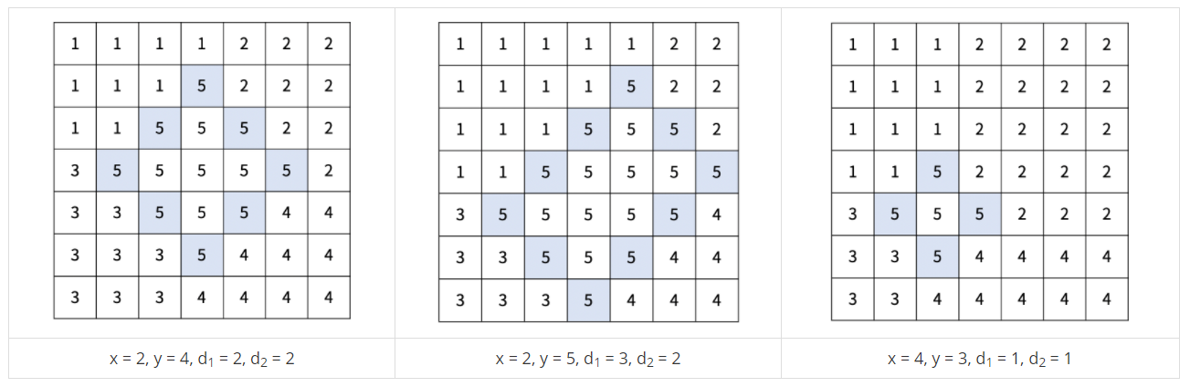 - 기준점 (x, y)와 경계의 길이 d1, d2를 정한다. (d1, d2 ≥ 1, 1 ≤ x < x+d1+d2 ≤ N, 1 ≤ y-d1 < y < y+d2 ≤ N)