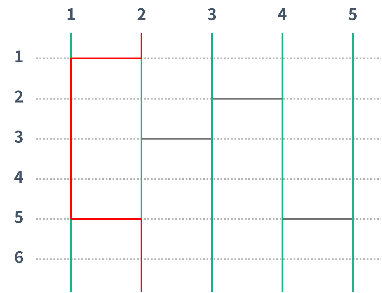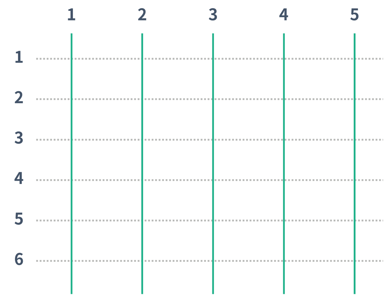 - 가장 위에 있는 점선의 번호는 1번이고, 아래로 내려갈 때마다 1이 증가한다. 세로선은 가장 왼쪽에 있는 것의 번호가 1번이고, 오른쪽으로 갈 때마다 1이 증가한다.