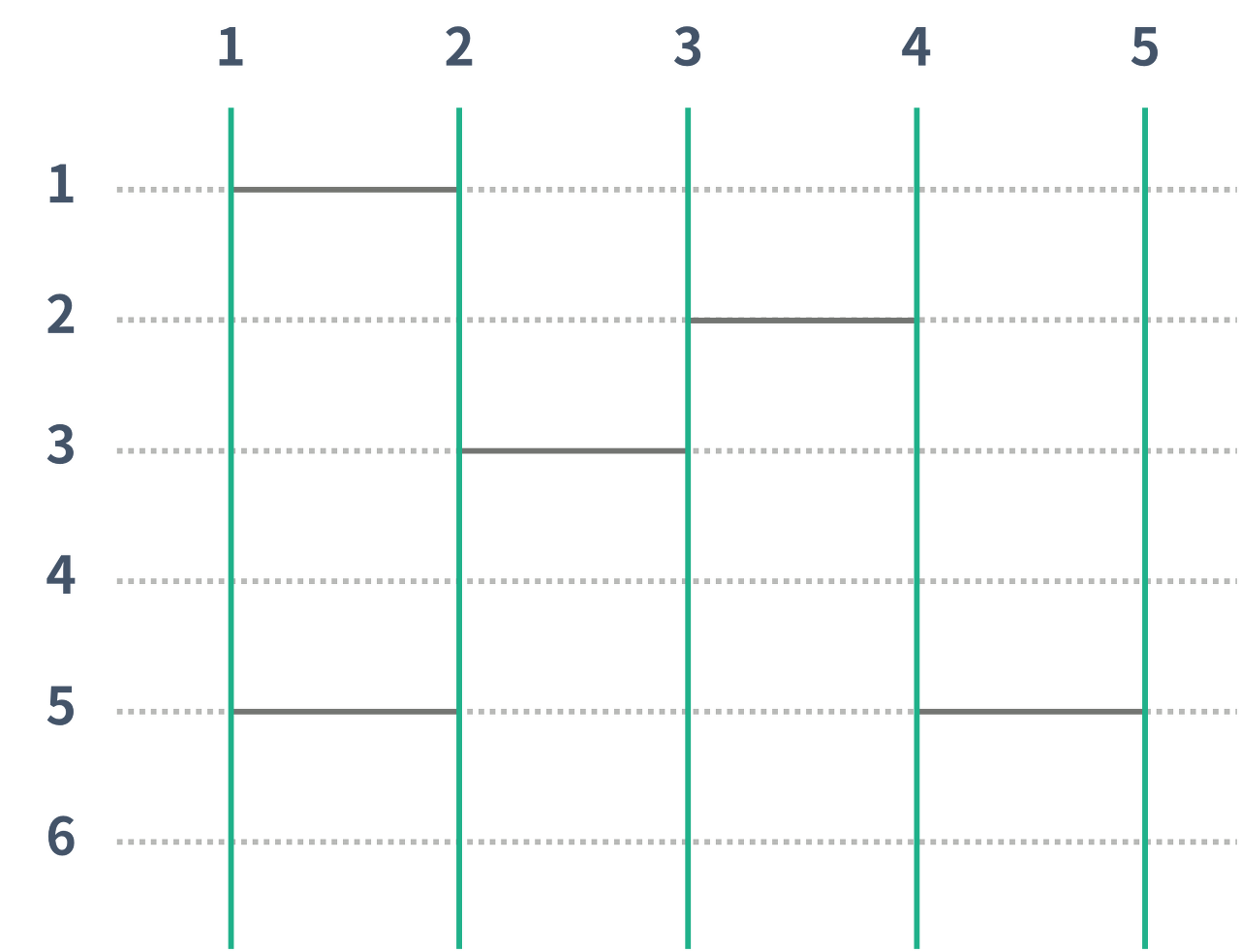위의 그림에는 가로선이 총 5개 있다. 가로선은 위의 그림과 같이 인접한 두 세로선을 연결해야 하고, 가로선을 놓을 수 있는 위치를 연결해야 한다.