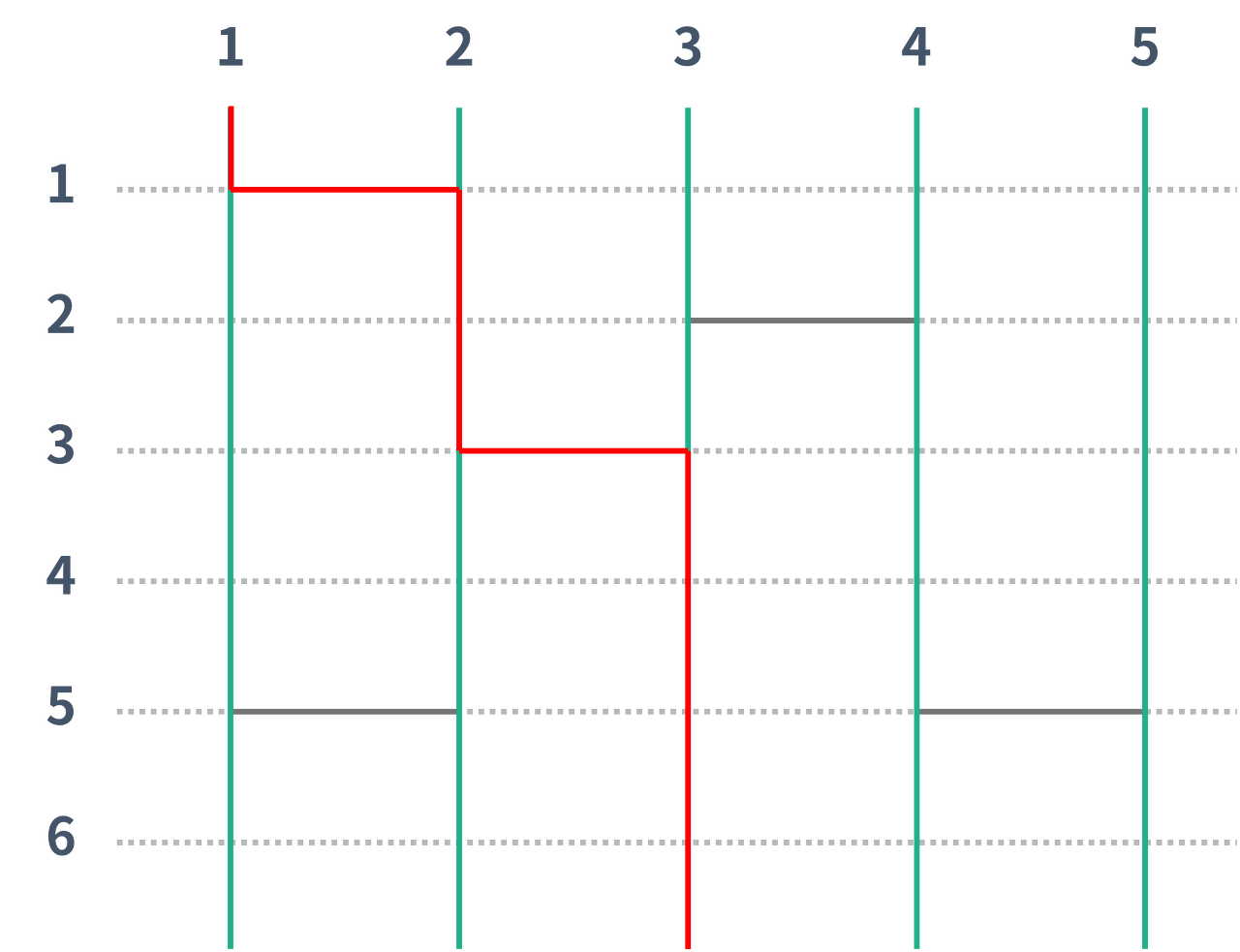 위의 그림에는 가로선이 총 5개 있다. 가로선은 위의 그림과 같이 인접한 두 세로선을 연결해야 하고, 가로선을 놓을 수 있는 위치를 연결해야 한다.