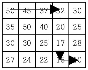 현재 제일 왼쪽 위 칸이 나타내는 지점에 있는 세준이는 제일 오른쪽 아래 칸이 나타내는 지점으로 가려고 한다. 그런데 가능한 힘을 적게 들이고 싶어 항상 높이가 더 낮은 지점으로만 이동하여 목표 지점까지 가고자 한다. 위와 같은 지도에서는 다음과 같은 세 가지 경로가 가능하다.