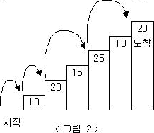 예를 들어 <그림 2>와 같이 시작점에서부터 첫 번째, 두 번째, 네 번째, 여섯 번째 계단을 밟아 도착점에 도달하면 총 점수는 10 + 20 + 25 + 20 = 75점이 된다.