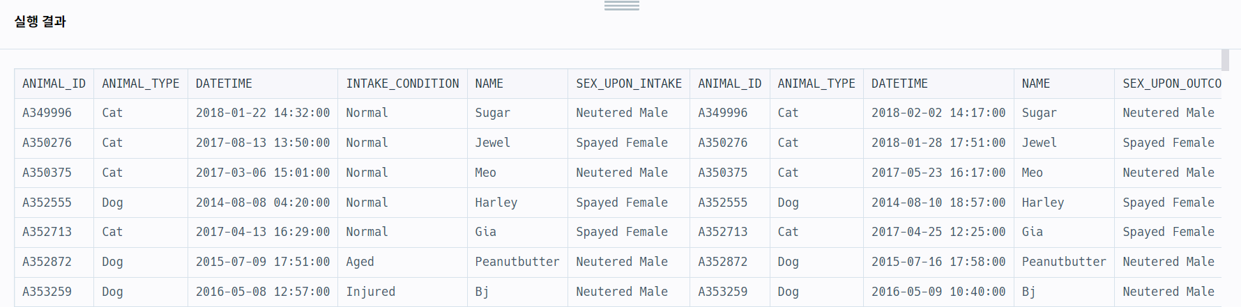 ANIMAL_ID, ANIMAL_TYPE, DATETIME, NAME, SEX_UPON_OUTCOME는 각각 동물의 아이디, 생물 종, 입양일, 이름, 성별 및 중성화 여부를 나타냅니다. ANIMAL_OUTS 테이블의 ANIMAL_ID는 ANIMAL_INS의 ANIMAL_ID의 외래 키입니다.