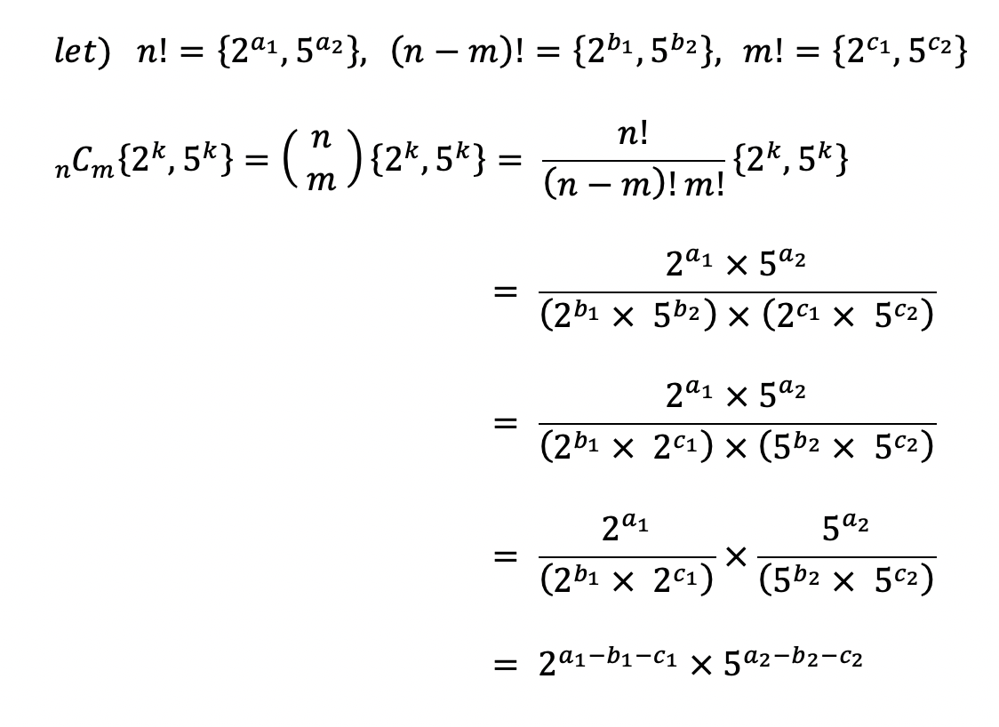 이번 문제는 이전의 팩토리얼의 0의 개수를 구하는 것과 비슷한 문제였다. 끝자리 0의 개수는 2와 5의 곱의 개수로 결정된다. 따라서 nCm = (n!) / (n-k)! * k! 에서 2와 5의 승수를 구한 후 그 중 최솟값을 찾아야 한다. 이때 지수는 나눗셈을 뺼셈으로 계산하기 때문에 n!에서의 2와 5의 개수에서 (n-m)! * m!에서 만들어지는 2와 5의 개수를 빼주면 된다. 유도된 식은 아래 그림과 같다.
