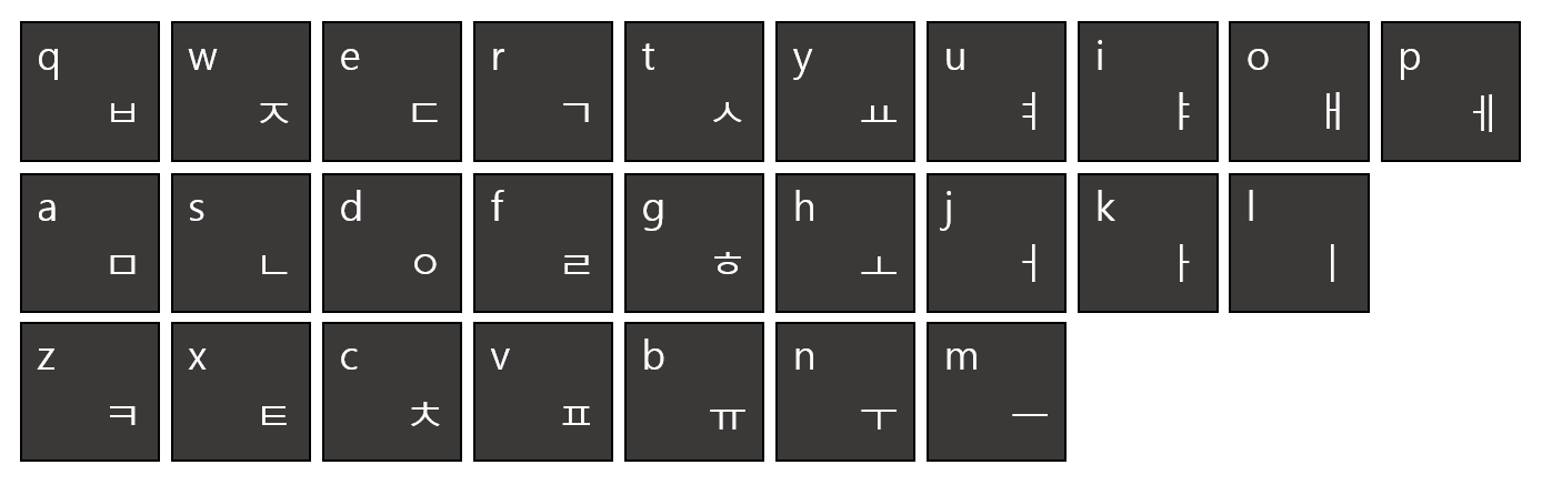 - 성우가 사용하는 키보드는 쿼티식 키보드이며, 아래 그림처럼 생겼다.
